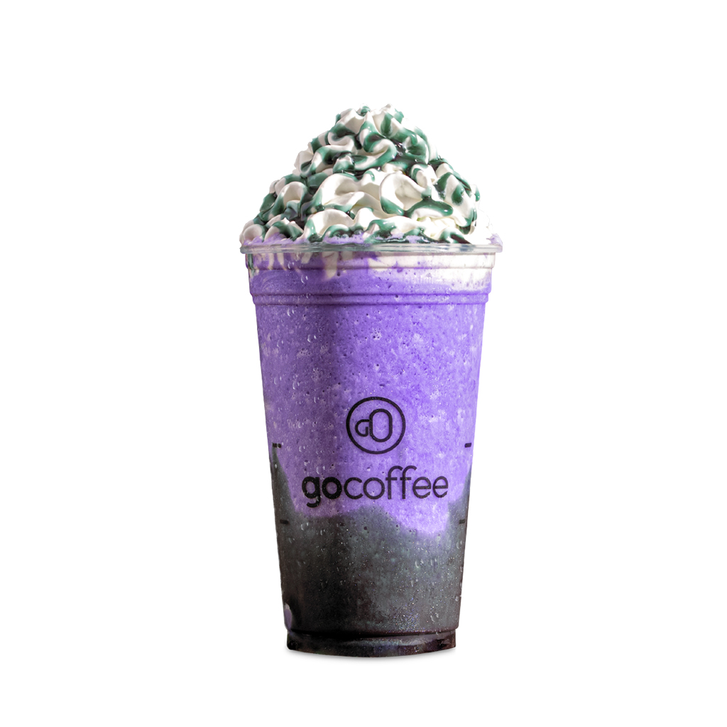 Frappe de Baunilha, Uva, leite e gelo, finalizado com chantilly e calda de Uva